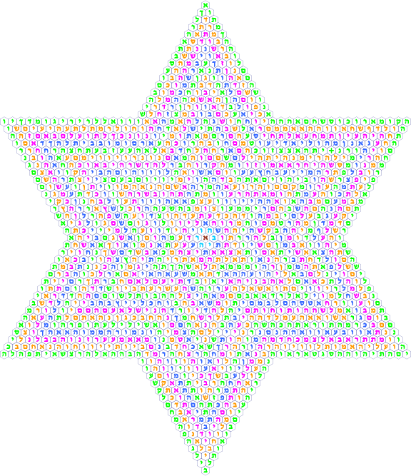 The colors are blue, pink, orange and green; in the first layer, immediately around the Center, 2 shades of blue appear, to show the pattern of first 6 Letters forming an hexagon, and then 6 Letters at the 6 points of the Star.
