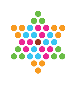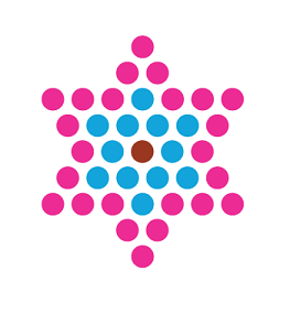 The center is represented as amber; the first layer, as blue (with 2 shades, to distinguish the inner hexagon from the outer points), the next one as pink, then orange, then green…