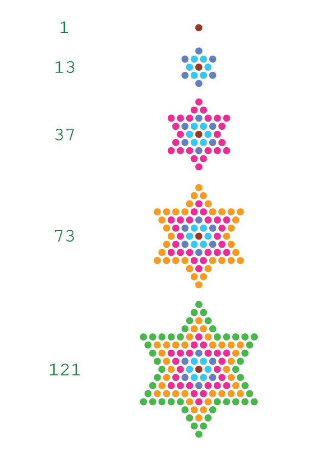 The sequence of the Star Numbers can be seen as starting with 1 (which appears as the center of all the different kinds of “centered figurate numbers”), or with 13, which is the first number actually representable in the shape of a hexagram.