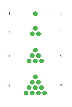 The triangle of 1 is 1, the triangle of 2 is 1 + 2 = 3 (the first literal “Triangular Number”); the triangle of 3 is 1+2+3 = 6, the triangle of 4 is 1 + 2 + 3 + 4 = 10, and so on…